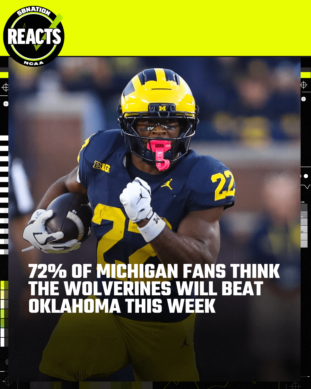 72% of voters believe Michigan will defeat Oklahoma at Memorial Stadium in Norman on Saturday night. This poll has a higher confidence than that of the ESPN Analytics Matchup Predictor, which gives Michigan a 46.5% chance of defeating Oklahoma.